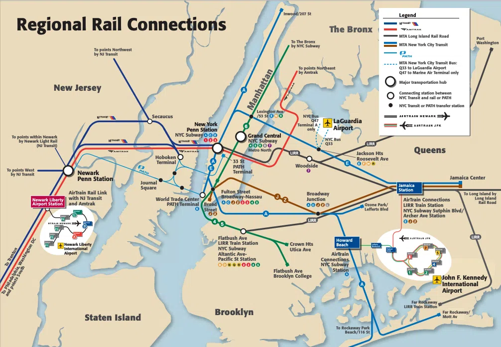 Hvis du i stedet tager LIRR-toget (Long Island Rail Road) videre fra Jamaica, er det lidt dyrere, men også hurtigere. Du kan tage toget til både Grand Central Terminal og Penn Station.